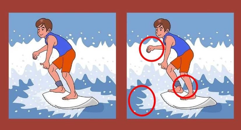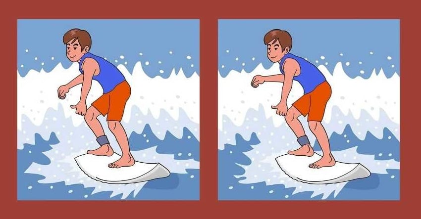En la foto vemos a un chico surfista que está conquistando las olas sobre una tabla de surf. A primera vista, puede parecer que los tipos de ambas fotos son iges, pero si te fijas bien, queda claro que no es así: en algún lugar hay algunas diferencias que hacen que las fotos sean distintas.