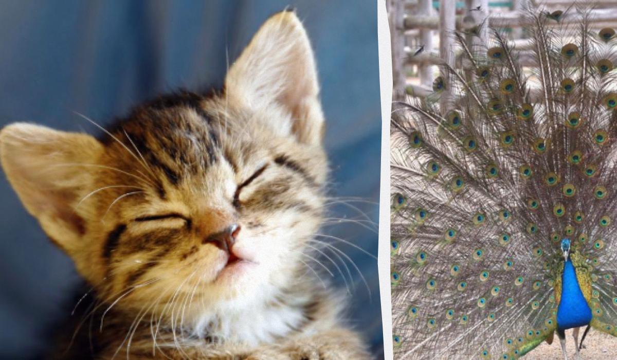 El gatito estaba detrás de la cola del pavo real / collage de Moje foto