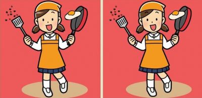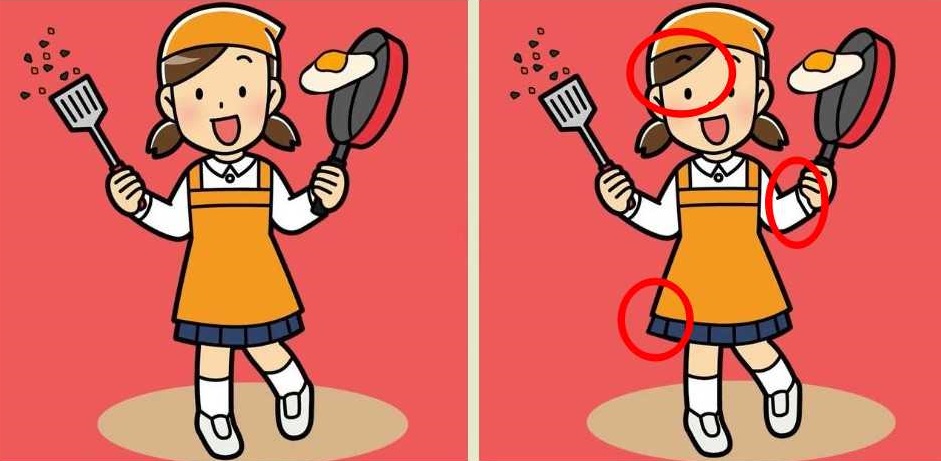 Ambos dibujos muestran a una niña haciendo huevos revueltos. Y parece estar en apuros, porque el huevo frito está a punto de caer al suelo desde la sartén.