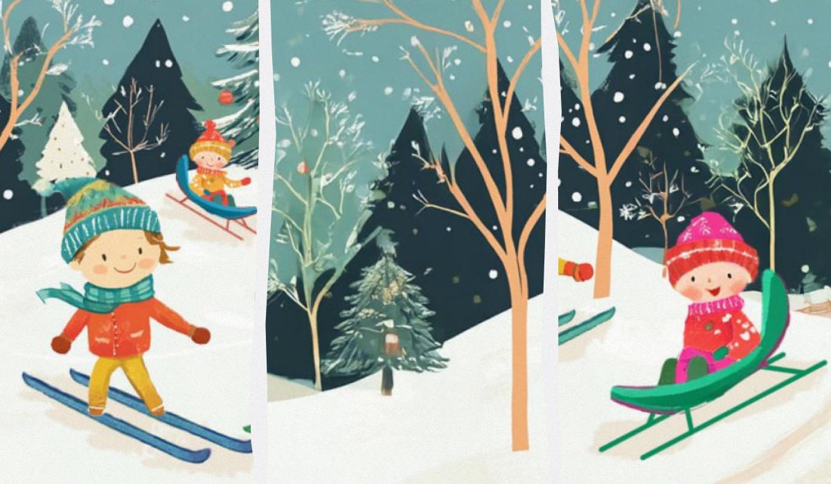Delante de ti hay un grupo de niños felices disfrutando de la nieve y del auténtico clima invernal en el bosque. Los más pequeños van en trineo y sus amigos mayores esquían.